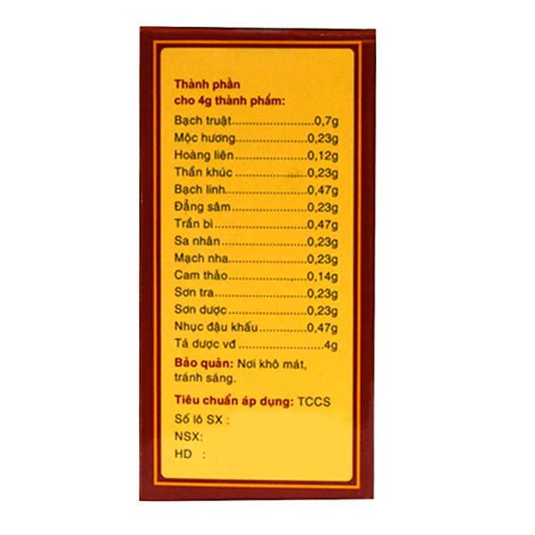 Pulveres Atractylodis macrocephalae, Pulveres Saussureae lappae, Pulveres Coptidis, Pulveres Codonopsis pilosulae, Pulveres Massa medicata fermentata, Pulveres Poria, Pulveres Citri reticulattae perenne, Pulveres Amomi, Pulveres Hordei germinatus, Pulveres Glycyrrhizae, Pulveres Mali, Pulveres Dioscoreae persimilis, Pulveres Myrsticae