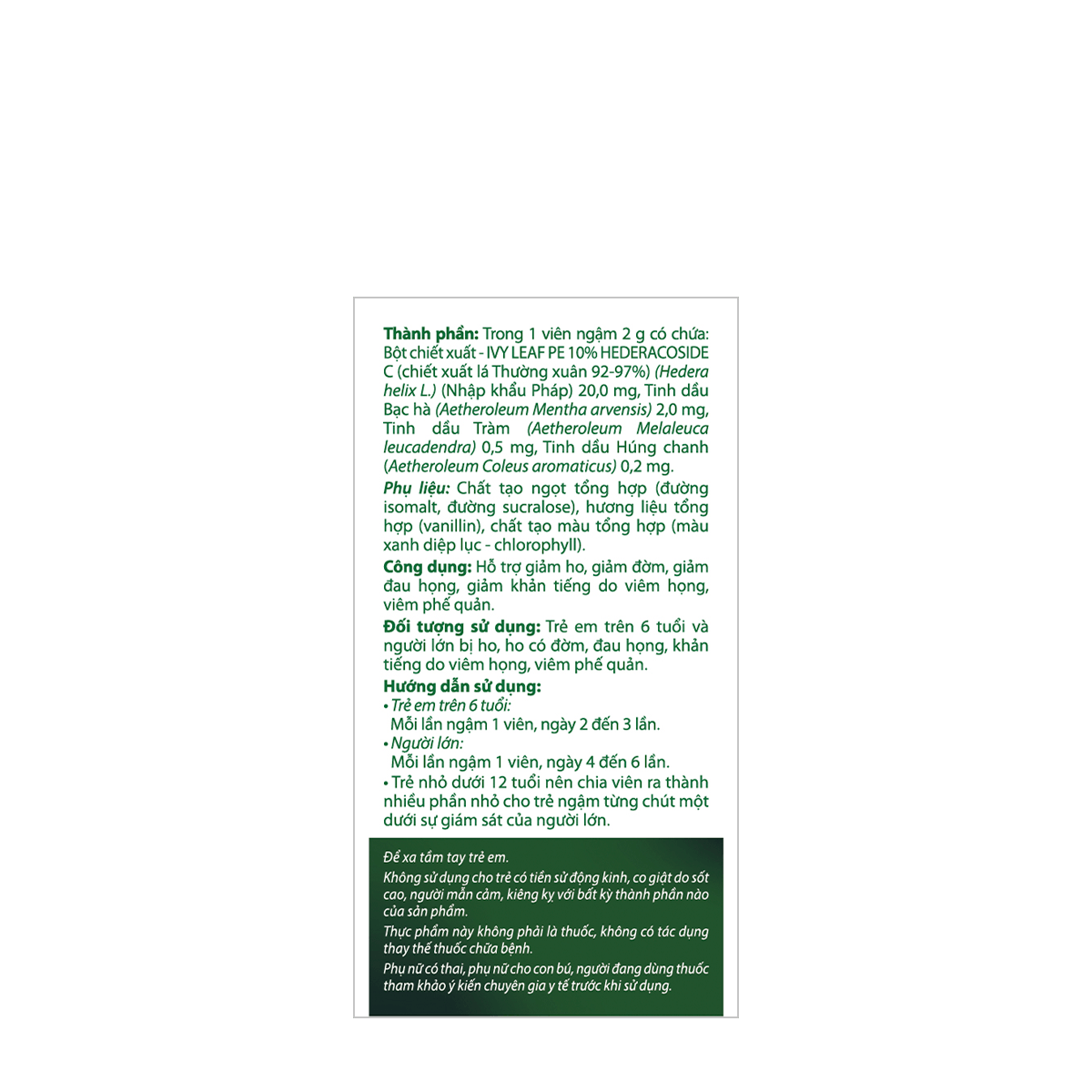 • Children under 12 years old should divide the tablet into small parts for them to swallow little by little under adult supervision.