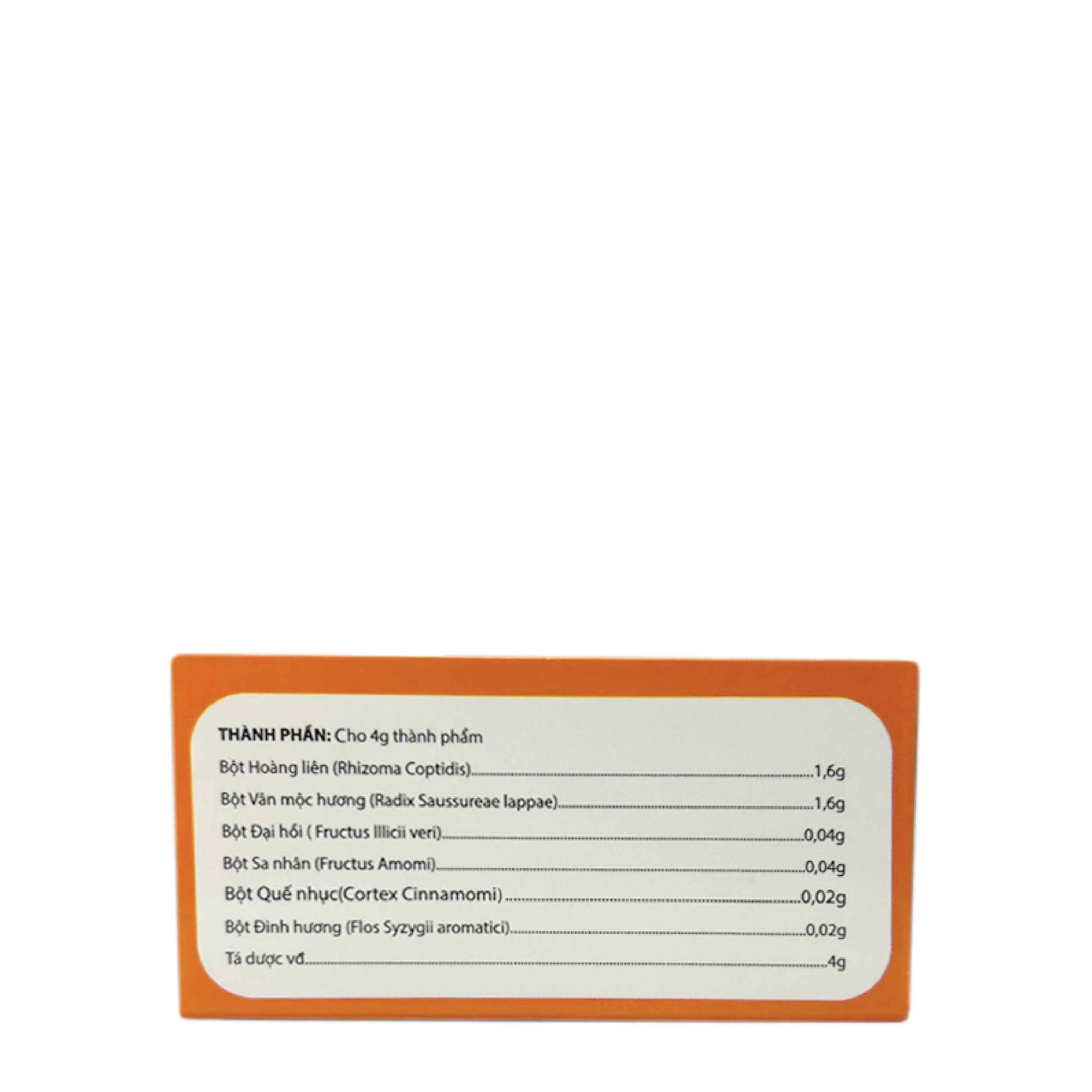 Pulveres Atractylodis macrocephalae, Pulveres Saussureae lappae, Pulveres Coptidis, Pulveres Codonopsis pilosulae, Pulveres Massa medicata fermentata, Pulveres Poria, Pulveres Citri reticulattae perenne, Pulveres Amomi, Pulveres Hordei germinatus, Pulveres Glycyrrhizae, Pulveres Mali, Pulveres Dioscoreae persimilis, Pulveres Myrsticae