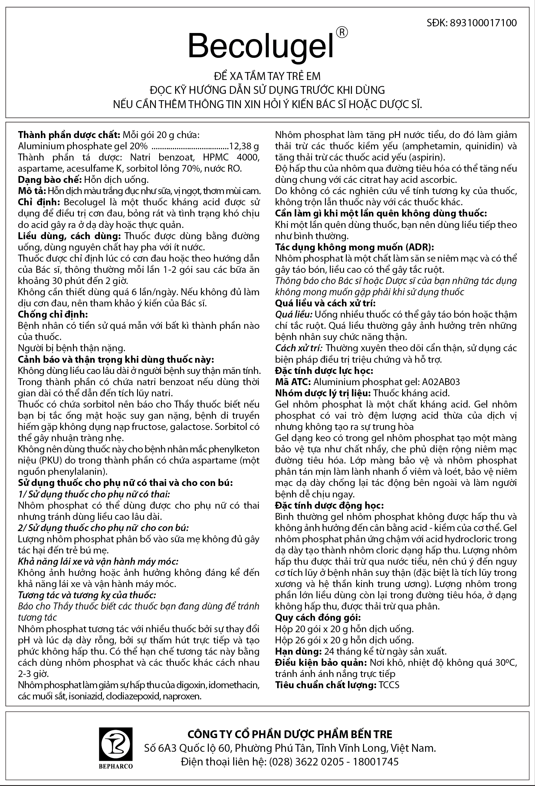 Nhà sản xuất: Công ty Cổ phần Dược phẩm Bến Tre