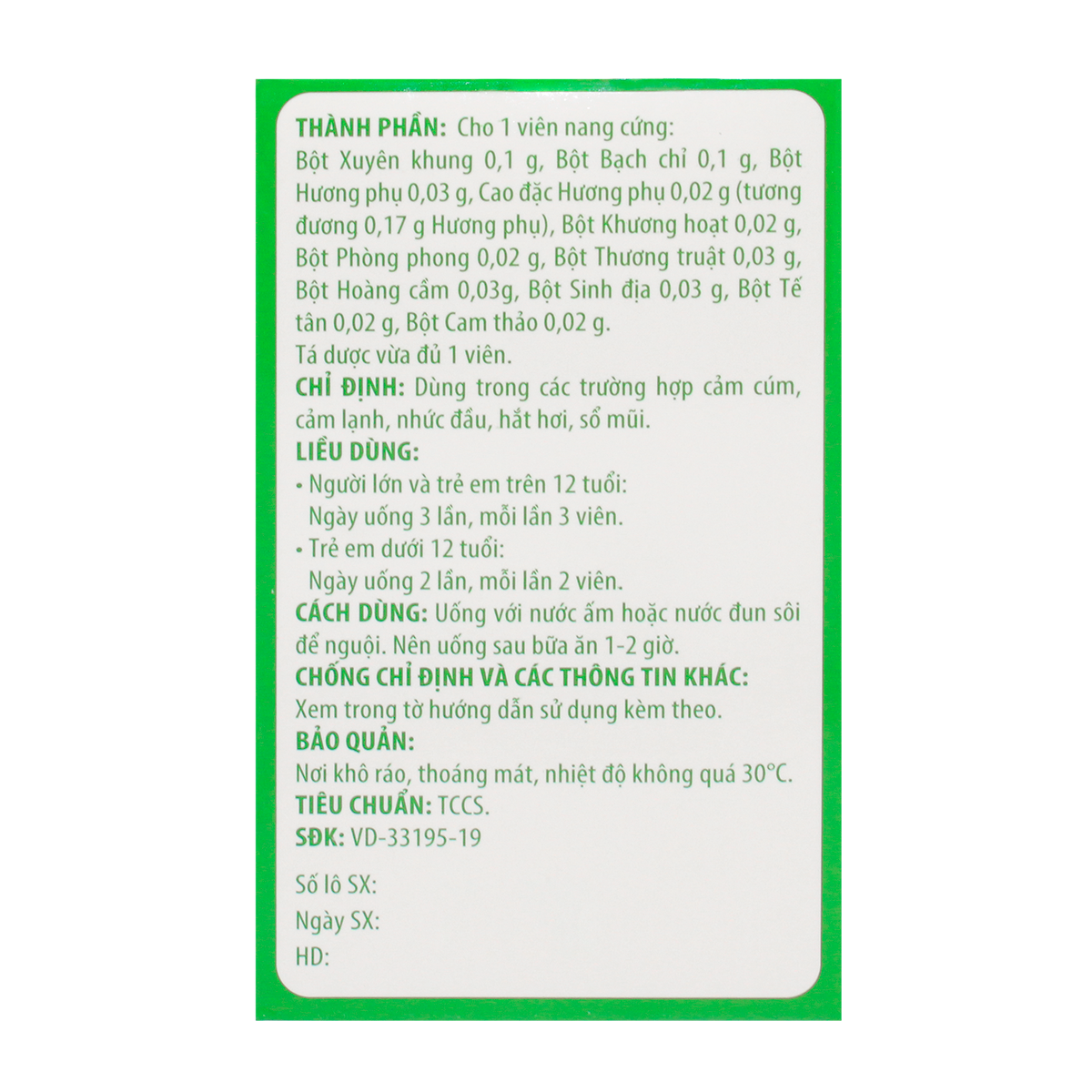 Xuyên khung 0,1g; Bạch chỉ 0,1g; Hương phụ 0,03g; Cao đặc Hương phụ 0,02g; Khương hoạt 0,02g, Phòng phong 0,02g; Thương truật 0,03g, Hoàng Cầm 0,03g; Sinh địa 0,03g; Tế tân 0,02g; Cam thảo 0,02g