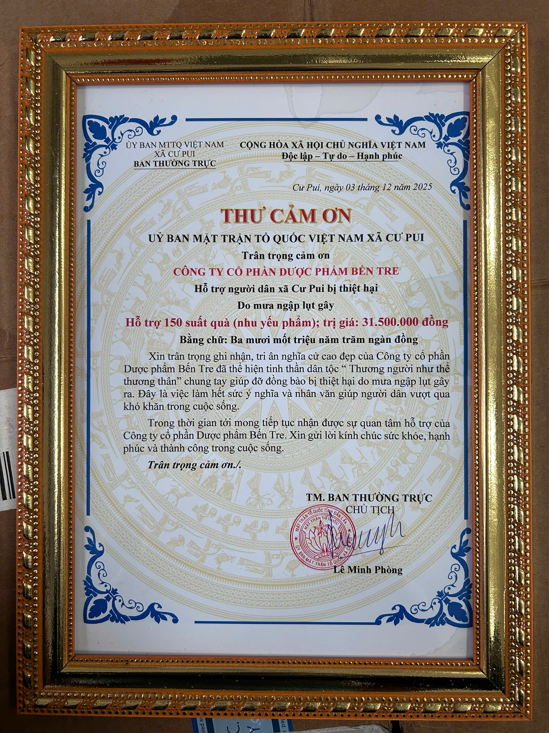 Trước những mất mát và thiệt hại nặng nề mà người dân xã Cư Pui, tỉnh Đắk Lắk phải gánh chịu sau đợt mưa lũ vừa qua, Công ty Cổ phần Dược phẩm Bến Tre (Bepharco) đã một lần nữa thể hiện tinh thần trách nhiệm cộng đồng và truyền thống nhân ái “lá lành đùm lá rách”. Với tấm lòng hướng về đồng bào vùng thiên tai, Bepharco nhanh chóng triển khai chương trình hỗ trợ thiết thực nhằm góp phần xoa dịu khó khăn và tiếp thêm nghị lực cho bà con nơi đây.